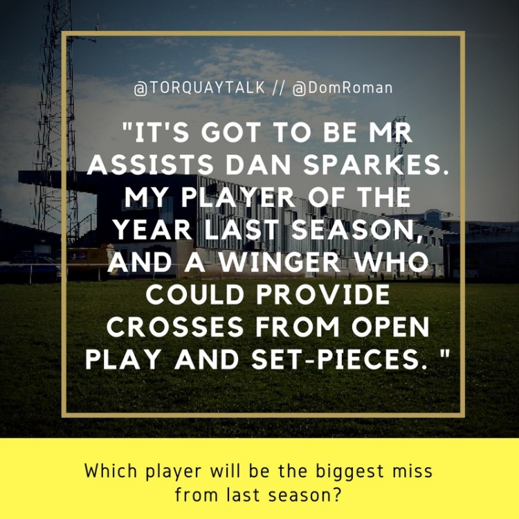 DR – It’s got to be Mr Assists Dan Sparkes. My player of the year last season, and a winger who could provide crosses from open play and set-pieces. His pro-active attitude and running will also be missed – I was gutted when he left for the Daggers.