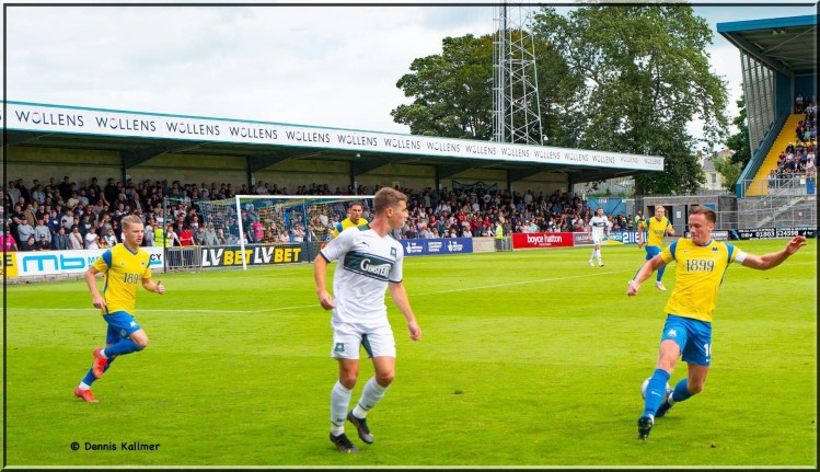 While not quite a maiden voyage for season 2021/22, the Truro midweek home game watching the new signings blend in with the squad who remain from last season had given us all a chance to see Gary Johnson’s new boys after the away win at Poole Town, but this was our first chance to see the squad up against League 1 neighbours Plymouth Argyle. A decent crowd of almost 2,400 created plenty of noise particularly from our old adversaries housed in the Babbacombe Road end, a stand that has been a talking point over the last couple of seasons in its benefits for being used by the home crowd, and for the first time in those couple of seasons it was well populated by a vociferous green army, gleefully claiming there’s only one team in Devon, Adam Randell is one of their own and resurrecting the old ‘aaaaaaaaargh you’re……..’ chant aimed at Gulls keeper Mark Halstead at every goal kick. Still, when it comes to singing, quantity not quality it seems.