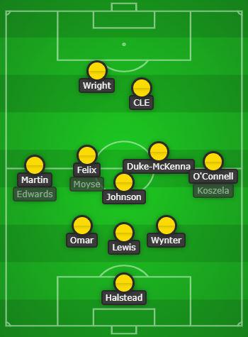 A 3-5-2 formation, which we’ve become used to more recently, Halstead making the start in place of MacDonald and O’Connell taking the place of the injured Little.