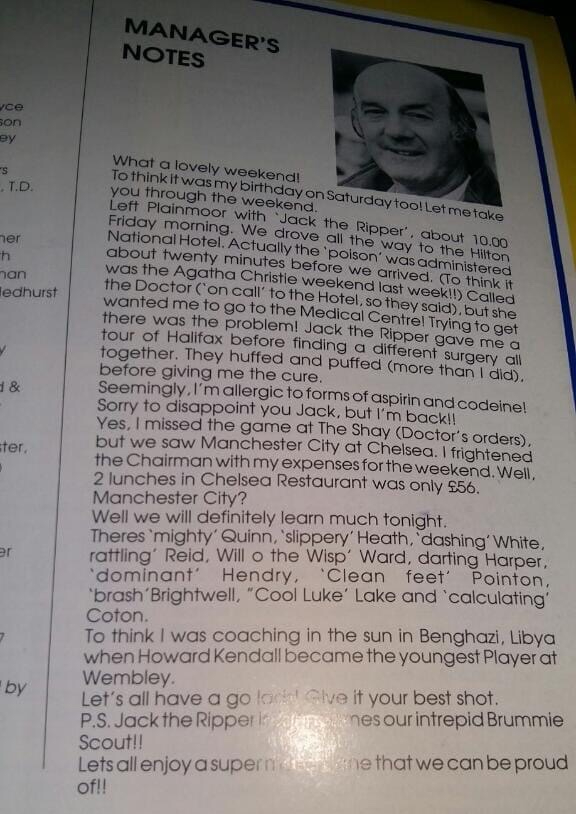 Smith was known throughout his career for quoting poetry. When United drew Manchester City in the second round of the Rumbelows Cup in the 1990-91 season, he described the City side that he would be facing using poetic licence. This included ‘mighty’ Quinn (Niall Quinn), ‘slippery’ Heath (Adrian Heath), ‘dashing’ White (David White), ‘rattling’ Reid (Peter Reid), ‘Will o the Wisp’ Ward (Mark Ward), ‘darting’ Harper (Alan Harper), ‘dominant’ Hendry (Colin Hendry), ‘Clean Feet’ Pointon (Neil Pointon), ‘brash’ Brightwell (Ian Brightwell), ‘Cool Luke’ Lake (Paul Lake) and ‘calculating’ Coton (Tony Coton).