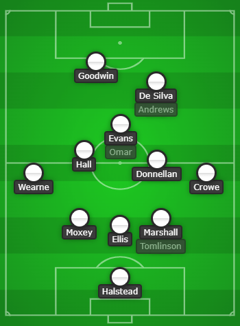Donnellan moved into midfielder with no Hanson or McGavin available and Crowe played in his natural RWB role providing assistance in attacks when needed. United played more of a direct game and found a weak link with Phipps at LCB and De Silva exploited that on a few occasions, mainly the winning goal. Evans sat behind the front two and was given the space to create which you feel is his best position. He also had some great chances in the game to score as well. The substitutions saw Tomlinson for Marshall and Andrews for De Silva, like for like changes in the dying minutes of the game, Omar came in for Evans and played a sweeper role to beef up the numbers at the back.