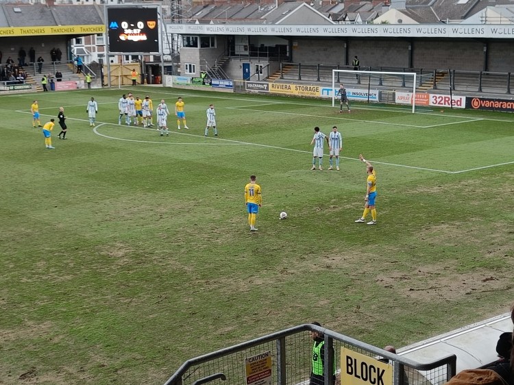 Absolutely dire. Four times in the first 45 minutes I was on the verge of falling asleep. A loud yawn from me at one point brought laughter from the row behind and comments of “yep, that sums the games up so far”. It’s hard to fathom how professional footballers can play the game so poorly and that applies to just about every player on the park, possibly leaving out Dillon de Silva and Ben Wyatt, who possibly had his best game in a Torquay shirt. Passes going astray from five yards away, foul throws, little in the way of attacking threat and so little to cheer that the half-time whistle was met with almost complete silence apart from seats going up for those waiting to go to the toilet or the canteen.