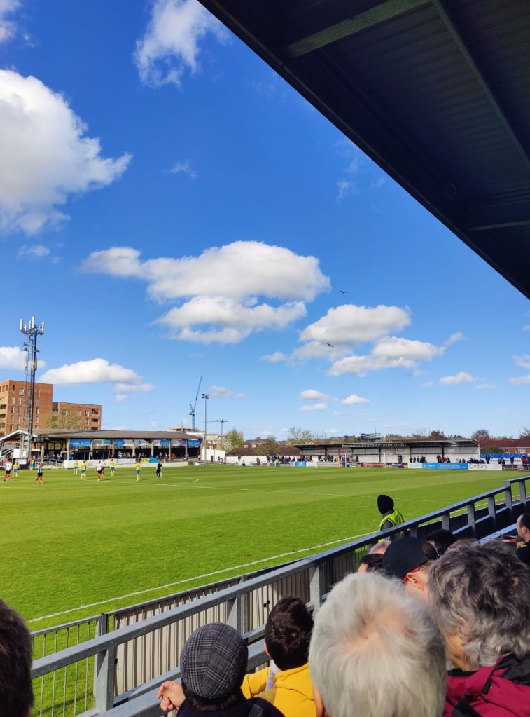 It was clear from Maidenhead train station that the Yellow Army had travelled well with Torquay fans never far from view around the town; the town of Maidenhead was a nice size with stadium, station and pubs all in close proximity – a pre-match pint in the aptly named Maiden’s Head and a bite to eat gave me the chance to speak with a few locals who were quietly optimistic they could clinch a survival-earning 3 points. Upon arrival at the ground you’re met with as basic a setup as you’ll find in the National League, it does however offer great views of passing trains, planes and red kites – all adding to the experience. Some quirky paintwork gives it some character and there is a part of me that loves grounds like this.