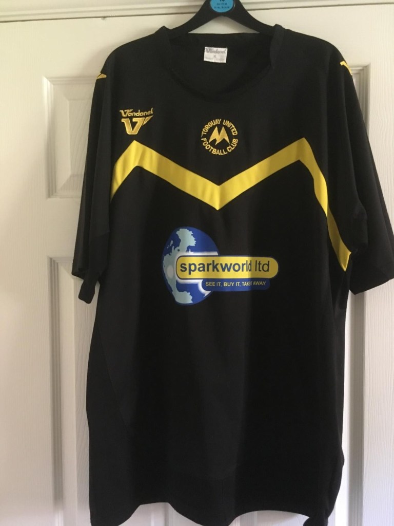 2019/20 Torquay United 120th Anniversary shirt, the black one with the gold 1899 and club crest and released after we had found our way back in the big time of National League, a shirt of real beauty although the season itself was curtailed by COVID, the shirt was lauded and bought up far and wide, and XXL sizes too!