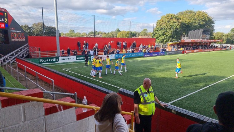 This did feel like fate was being tempted, as whilst the chant was dying down Hemel forced an equaliser. The corner was swung in and forced a goalmouth scramble that somehow found it’s way into Halstead’s net. From the far end we could not quite work out what had happened, although it again looked like poor defending from a set piece.