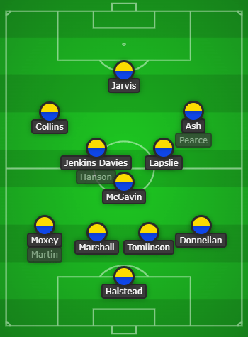 4-3-3 with Ash and Collins either side of Jarvis. McGavin the deepest of the midfield three. Jarvis was very isolated upfront; the wingers sat quite wide which gave Jarvis very few options if he did get on the ball. We looked out of ideas in the final third very early on in the game.