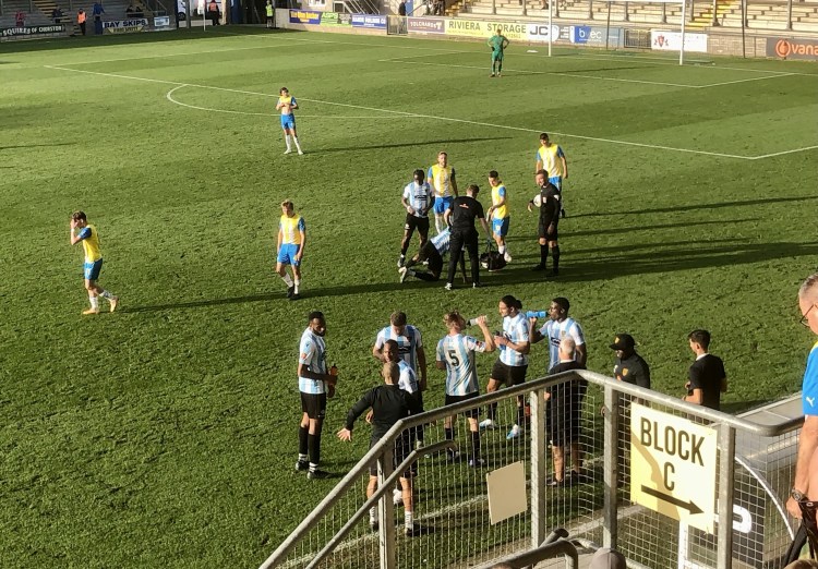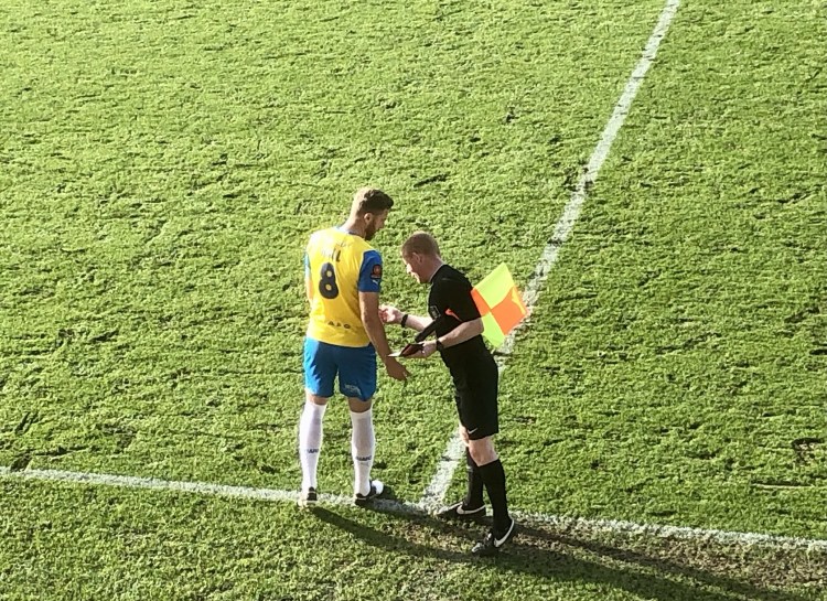 Torquay were lacklustre from the go, as Maidstone made all the running. Corner after corner defended gingerly by the below-par Gullsโ, and it seemed only a matter of time before the Stonesโ would score. Somewhere inside the opening 35 minutes of this bumbling horror show, a comedy of errors led to a game changing decision as Marshall saw red. A spectacularly awful throw from Donnellan saw Marshall reeling towards his own goal, but an equally pathetic backpass fell short of Halstead only for Marshall to haul his man down. Not for the first time in his TUFC career. Torquay’s #1 saved smartly to his right to deny the visitors as Plainmoor erupted with joy.