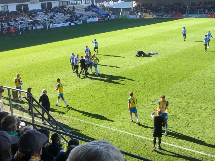 One more than normal. It being the FA Cup we were delighted to welcome a fourth official again. He looked about 15 and was kept busy rolling balls on as Maidstone repeatedly challenged the swimming pool roof. I thought the referee was timid. He had a chance to send a Maidstone player off for an “orange” aerial challenge in the first half. No point blaming him though. The failings at Torquay are all self-inflicted.