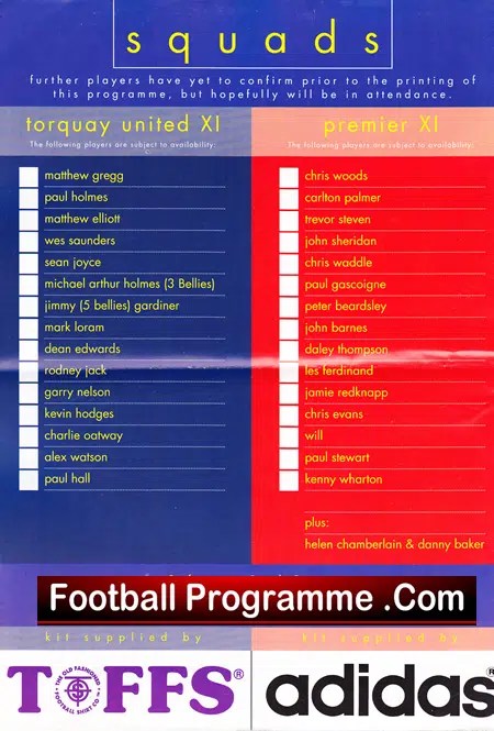 However, not all testimonials played at the home of the Gulls have been awarded for ten years of loyal service. Other individuals to receive one include former physio Norman Medhurst (the night of a thousand caps which saw a Ron Greenwood England XI face a Bobby Robson England XI), John Uzzell (A Torquay-Plymouth Argyle XI vs Coventry City), but perhaps the most intriguing testimonial match was Wes Saunders testimonial in 1997.