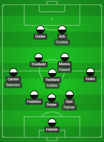 Mussa and Threlkeld subbed at half time for Collins and Hasani, with Carson going off for Seymour and Ash for Crosbie with ten minutes to go and finally Dyer for Palmer in the dying minutes.