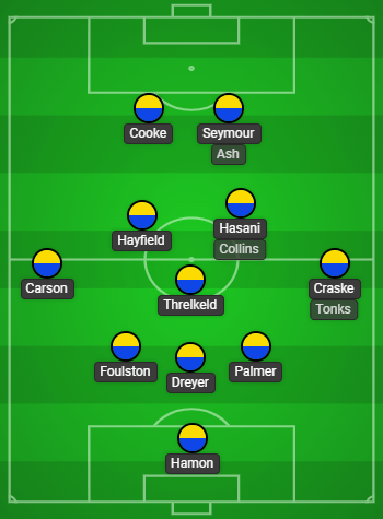 3-5-2 as per, but with four changes. Palmer came in for Dyer, who limped off late on Saturday. Craske was the preferred Finley at right wing back. Hasani got a go in the only creative role, and Ben Seymour was given a run-out ahead of Ash.
