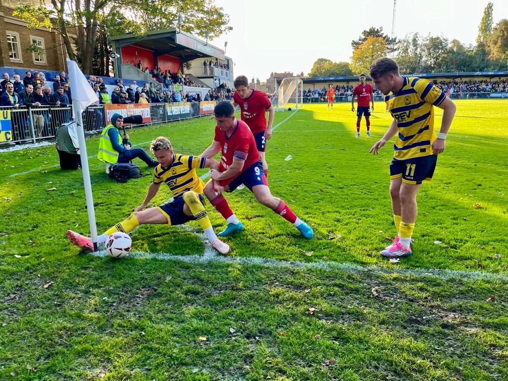 Buoyed by another incredible Yellow Army turnout on the road (Approx. 800?) it was a quiet start to proceedings with Hampton & Richmond happy to enjoy plenty of possession without doing an awful lot with it. United grew into the game and got their rewards on the 20 minute mark. A Free kick straight from the training ground saw WJD feint to deliver a central free kick into the box, before sliding it left to Matty Carson waiting to deliver a “Buffet Ball” for Cody Cooke to gobble up, a cracking header into the bottom of the corner, which the England U-19 Goalkeeper Ted Curd stood no chance in saving. 1-0!