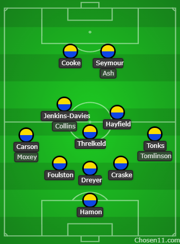 Usual 3-5-2 shape that Wotton likes us to set up in. Fin Craske came in for Palmer at RCB and WJD was opted for instead of Hasani which seemed a little harsh to me! Wotton opted for Seymour to partner Cooke up top against his former side.