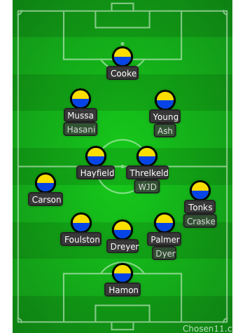A system we have come accustomed to seeing, with Mussa & Young playing off Cooke, Carson & Tonks providing the width. Changed to a 4-4-2 (remember that one) with the introduction of Ash.