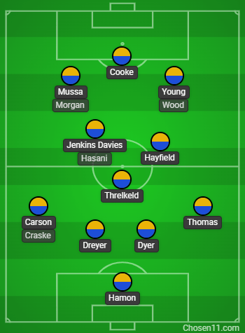 4-3-3 with Thomas and Carson coming in at full back. Midfield and attack remained unchanged from the Hemel game.