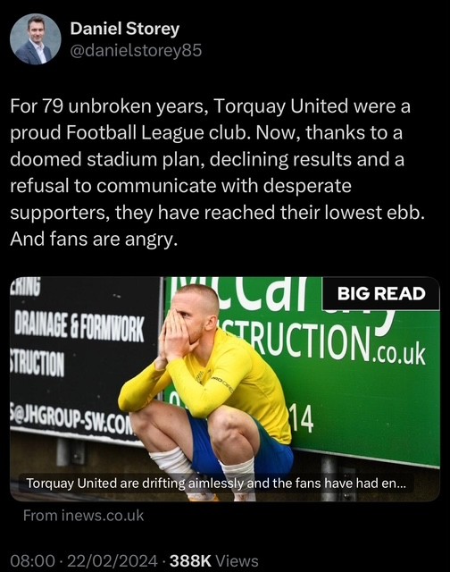 A tweet from Daniel Story, a journalist with The I newspaper had gone out with a link to an article covering the then owner Clark Osborne and the state of Torquay United Football Club.