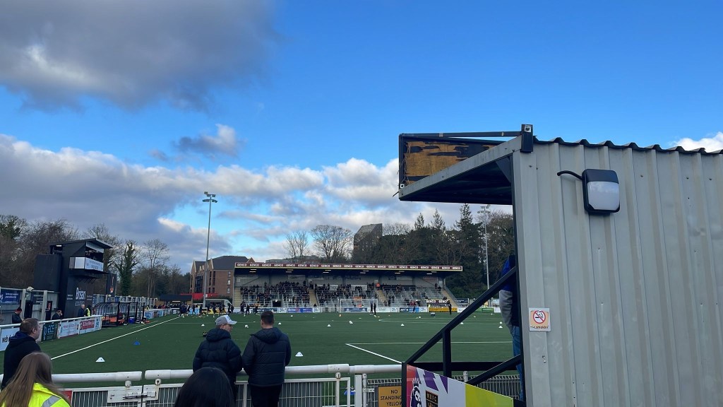 Enfield Town: A really quirky ground, this. There are some big industrial estates in Enfield, and it felt as though Andy, Olly (his dog) and I traipsed through most of them before finding the lovely little oasis that is the Queen Elizabeth II Stadium. It’s a small athletics venue with some interesting history, and as you might expect at a fan-owned club we got a warm welcome. There were pints and chat upstairs in the Art Deco pavilion, and we never really budged from there. The pitch was a long way away but the sightlines were good. Despite a silly early shove by Jordan Dyer which gifted Enfield a penalty and the lead, we were way better than the newcomers and it was a comfortable 4-1 win. The Moose was unplayable, and had we known we wouldn’t win away again for 3 months we might have celebrated harder. Still, we now know we have to go back there next year, so perhaps we’ll do it then…
