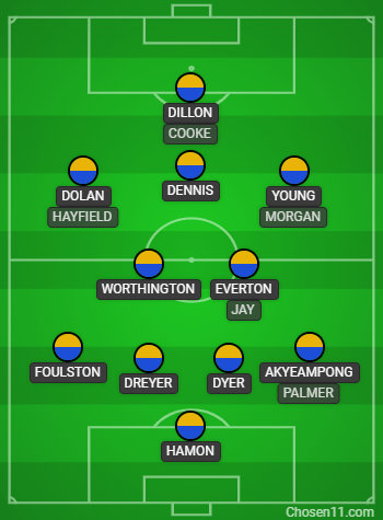 4-2-3-1 again. Back five for the last ten. SBLE a straight swap for Keane Anderson in the centre.