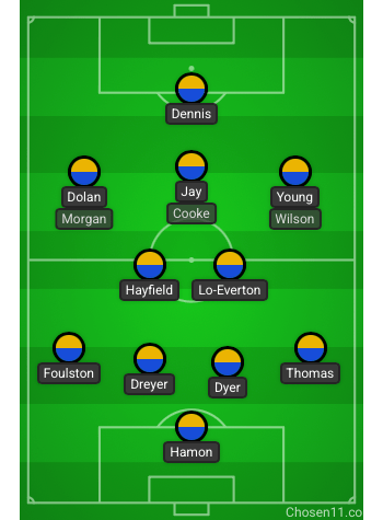 A familiar 4-2-3-1 with Dennis leading the line. Young and Dolan provided the width with Lo-Everton & Hayfield in the deeper lying midfield positions.