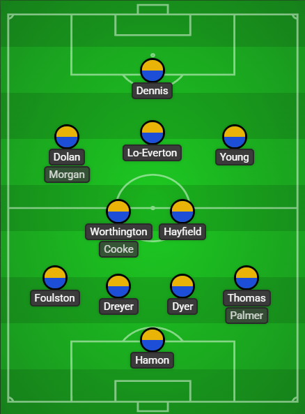 A familiar 4-2-3-1 with Dennis leading the line. Young and Dolan provided the width with Lo-Everton playing in the 10 role, Hayfield and Worthington partnered in the deeper lying midfield positions.